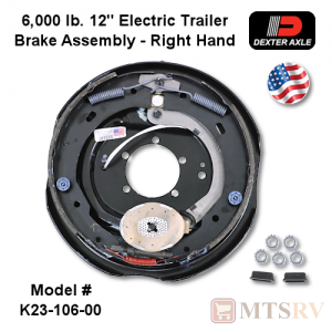 The Dexter Axle Model K23-106-00 is a 12" electric brake assembly with a 6,000 lb. rating and meets all DOT standards, plus they are CSA approved for our Canadian customers. This brake assembly has a 5-bolt pattern and fits most standard hub-and-drum assemblies, including Dexter, Lippert (LCI), and AL-KO. This item is brand new, in stock and ready to ship.