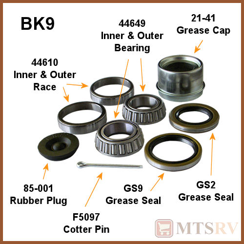 The Franklin model BK9 Replacement Bearing Kit (1-1/16" x 1-1/16") comes with two 44649 bearings, both the inner and outer race, GS2 and GS9 grease seals, a cotter pin, a rubber plug and a lube dust cap. It is made to replace the bearings in the following hubs/drums: 146B, 156B, 15613B and 388B. Brand new, in stock and ready to ship.